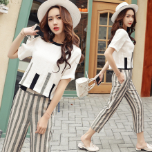 圆领2017年夏季套装/套裙个性潮流条纹优雅短袖两件套九分裤