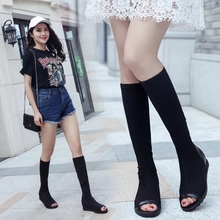 春夏新款鱼嘴露趾弹力靴高跟长筒厚底凉靴坡跟长靴子内增高显瘦靴