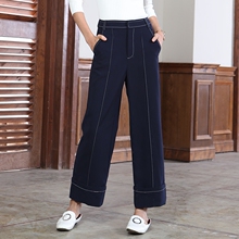 明线装饰深蓝色大卷边高腰直筒裤 拖地长裤子女士阔腿裤 春秋2017