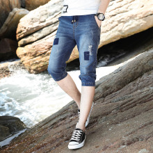 2017夏季薄款牛仔短裤男破洞七分裤松紧腰围潮流中裤收口7分马裤