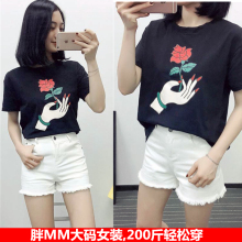 大码短袖T恤女胖mm中长款宽松200斤夏装弹力加肥加大纯棉印花上衣