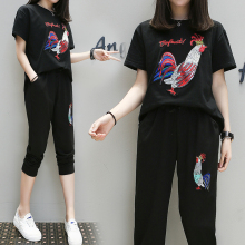 欧洲站2017夏装新款大码女装修身短袖连衣裙刺绣休闲小脚裤两套装