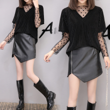 2017春夏装大码女装胖mm清凉条纹T恤+波点网纱两件套胖妹妹套装裙