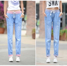 大童少女初中学生牛仔哈伦七分裤女夏松紧腰宽松马裤青少年中裤薄