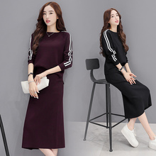 2017春秋新款韩版时尚修身中长款高腰半身裙女士休闲针织两件套装