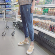 日系文艺卡通刺绣春夏款9分牛仔裤男韩版修身水洗青年小脚九分裤