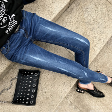 金富客韩版九分裤毛边裤脚破洞牛仔裤 修身弹力显瘦铅笔裤小脚裤