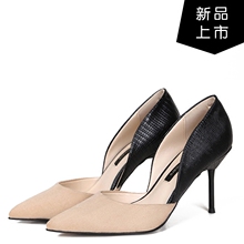 2017夏新款时尚百搭尖头浅口细跟中空女单鞋真皮拼接鞋高跟鞋女鞋