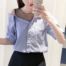 潮网纱拼接上衣2017夏装新款条纹露肩短袖t恤女夏天衣服打底小衫