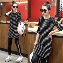 2017新款韩版长袖T恤女中长款纯色条纹修身显瘦纯棉百搭打底衫潮