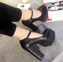 2015春欧美厚底气质百搭黑色尖头高跟女单鞋防水台粗跟一字搭扣