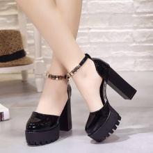 2017年春季新款粗跟防水台系带单鞋黑色厚底高跟鞋欧美女鞋百搭潮
