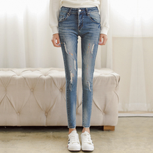 2017春新款韩版破洞补丁牛仔裤女弹力修身显瘦九分小脚铅笔裤