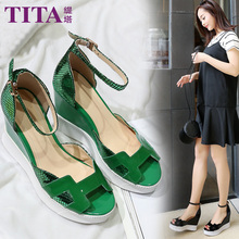 厚底坡跟女鞋子2016夏季新款防水台女士高跟鞋撞色一字带真皮凉鞋