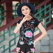 民族风 加大码女装 2017夏季新款 刺绣花 中国风 立领 短袖T恤女