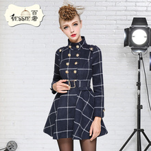 格子英伦风羊毛修身OL风双排扣立领毛呢外套 BESSIE2016冬装新品
