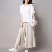棉麻套装女装大码2017夏民族风亚麻短袖t恤上衣+九分阔腿裤两件套