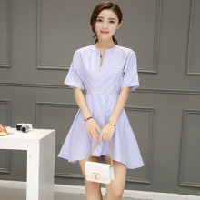 2017夏装新款韩版中长款修身高腰小清新条纹连衣裙A字短裙女学生