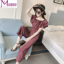 九分连体裤子女2017夏季新款一字领条纹露肩阔腿荷叶边高腰连衣裤