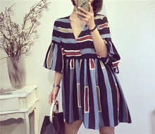 2017夏新款韩版亚麻条纹大码宽松中长款短袖大摆连衣裙女装长裙子
