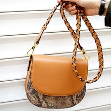 MISSDEER欧美风撞色蛇纹马鞍包编织肩带真皮复古女单肩斜挎包 潮