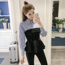 春装新品假两件条纹衬衫拼接收腰裙摆上衣女荷叶边长袖修身打底衫