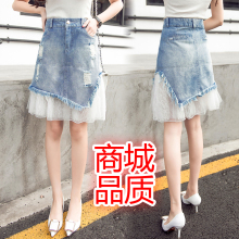欧洲站2017夏装新款磨破洞高腰A字牛仔裙网纱拼接牛仔半身裙中裙