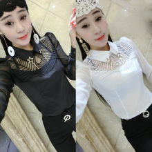 2017欧洲站春季新品显瘦长袖上衣大码女网纱拼接钉珠镂空立领衬衫