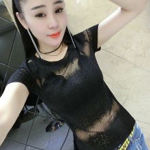 欧洲站夏装新款时尚性感镂空透视纱网T恤修身V领上衣百搭蕾丝小衫