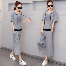 运动套装女夏休闲服三件套韩版七分裤阔腿裤英伦风宽腿裤潮2017