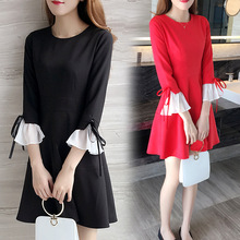 女神范荷叶边裙2017春装新款韩版女装修身显瘦蝴蝶结喇叭袖连衣裙