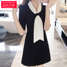 春装2017新款女雪纺连衣裙韩版时尚拼色领结款显瘦小黑裙子女夏季