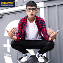 春季青年格子休闲男士衬衫青少年韩版长袖薄款学生修身潮流衬衣