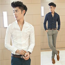 男士长袖衬衫韩版修身款春秋免烫男装衬衣男式V领个性寸衫夜店潮