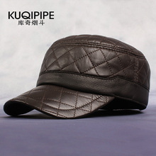 库奇烟斗男士真皮帽子秋冬季韩版羊皮平顶军帽格子纹中老年帽鸭舌