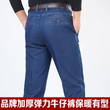 品牌秋冬厚款弹力牛仔裤男士中年高腰直筒宽松商务牛仔男裤加绒款