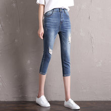 夏季新款大码破洞七分牛仔裤女做旧显瘦小脚铅笔裤胖mm弹力七分裤