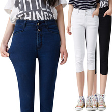 高腰牛仔七分裤弹力女nzk夏薄款大码白色牛仔裤女小脚裤7分铅笔裤