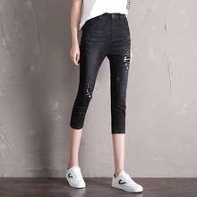 春夏新款大码高腰破洞七分牛仔裤女显瘦胖mm铅笔裤黑色小脚七分裤