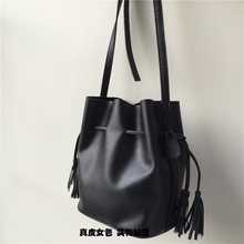 真皮纯牛皮 2017 新款韩版流苏水桶包女包百搭单肩包斜挎包母子包