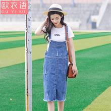 破洞牛仔背带裙女半身裙2017夏装新款韩版宽松学院风中长款连衣裙