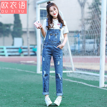 2016新款破洞牛仔背带裤女冬长裤宽松休闲学院风吊带连体裤九分裤