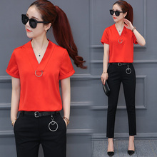 2017夏装新款短袖V领时尚气质显瘦红色雪纺衫女百搭夏季衬衣上衣