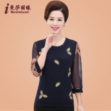中老年女装春装长袖T恤短款妈妈装纱袖打底衫40-50岁中年新款上衣