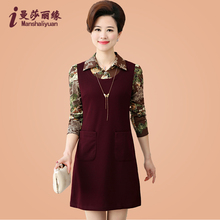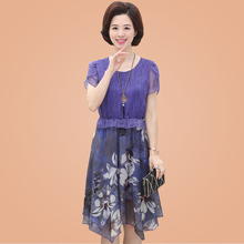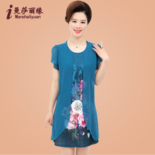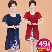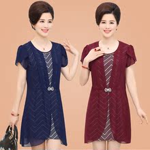 妈妈装夏装短袖连衣裙中长款中老年女装假两件雪纺衫40-50T恤上衣