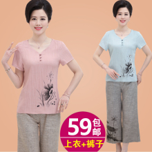 妈妈装夏装套装大码棉麻中老年女装休闲两件套40-50岁中年短袖T恤