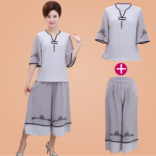 中年妈妈装夏装套装大码雪纺衫中老年女装民族风短袖两件套阔腿裤
