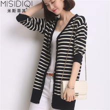 100%纯羊毛衫2017春秋新款大码中长款黑白条纹开衫女针织毛衣外套