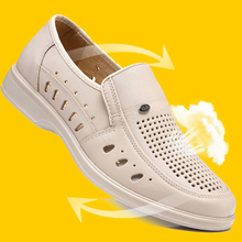 夏季米白色镂空鞋真皮休闲男鞋中老年浅色打孔男凉鞋软底洞洞鞋