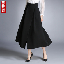 春秋新款不规则半身裙女黑色中长款高腰A字裙前开叉裙子拼接长裙